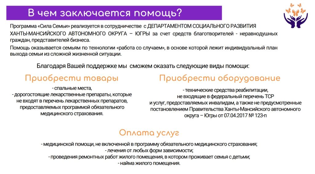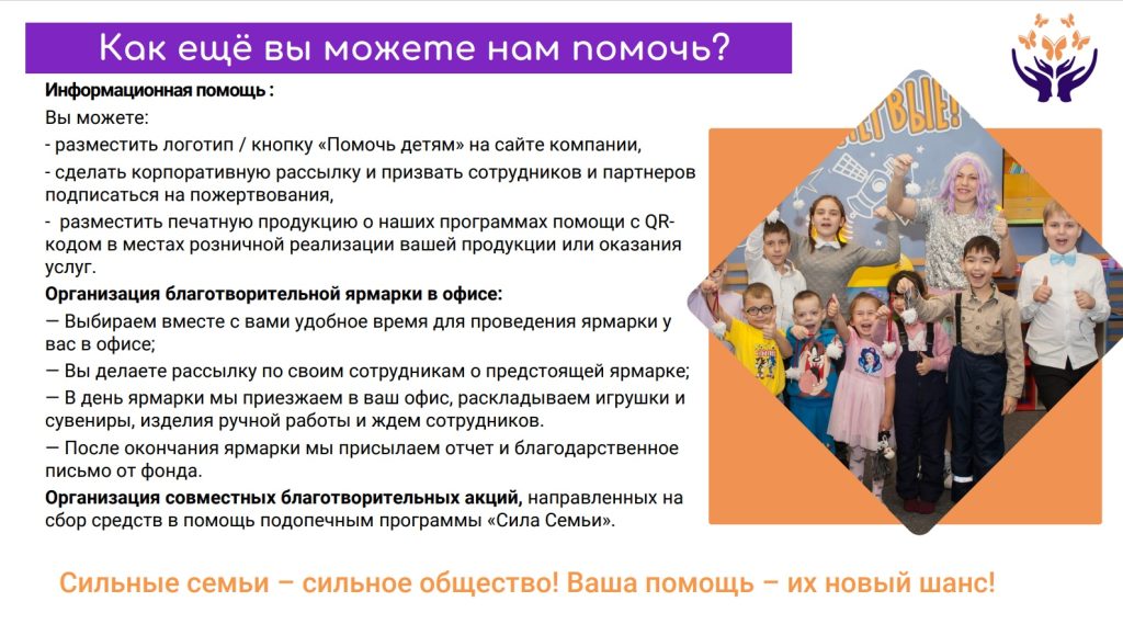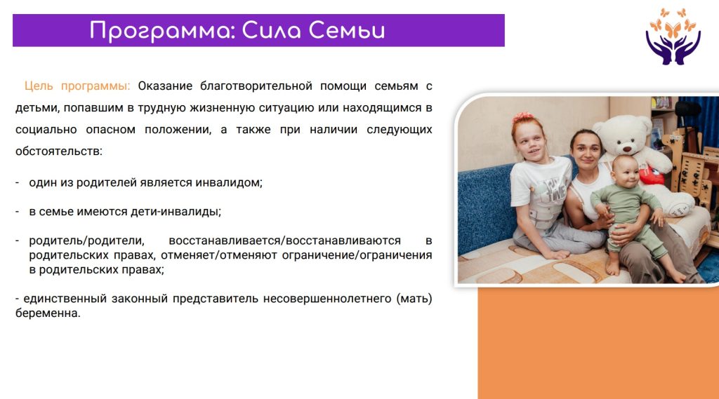 На сегодняшний день фонд активно реализует ряд программ, направленных на помощь и поддержку: