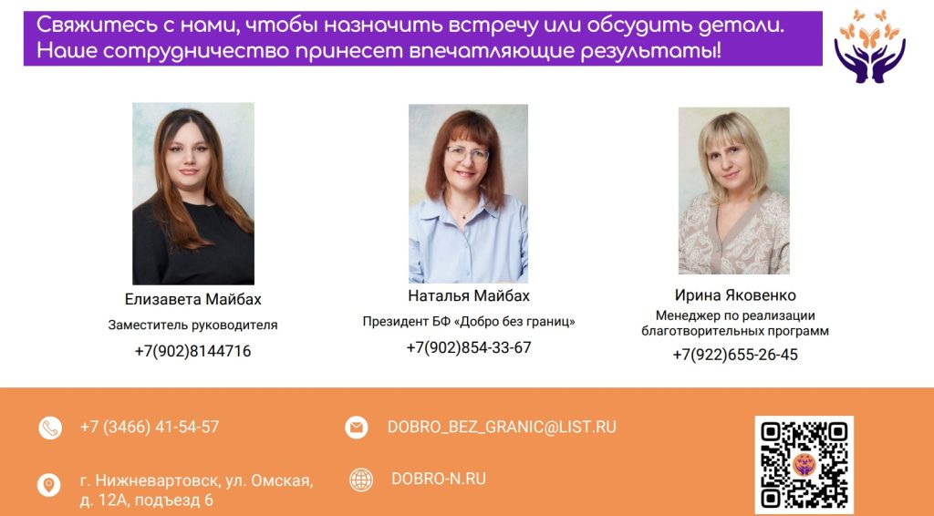 В Нижневартовске работает Благотворительный фонда помощи нуждающимся «Добро без границ» ! Эта инициатива группы неравнодушных людей стала важным шагом на пути к поддержке тех, кто сталкивается с трудностями, будь то дети, взрослые или пожилые люди с ограниченными возможностями здоровья