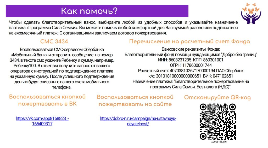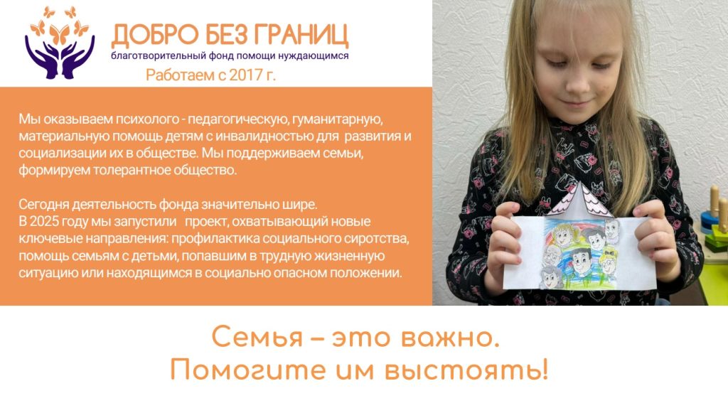 «2 апреля – Всемирный день распространения информации об аутизме»Также активно помогают гражданам, прибывшим с территорий ЛНР и ДНР в рамках программы «Территория добра»Фонд получил социальную франшизу ДоброЦентра и продолжает развивать волонтерство и добровольчество. Их программы уже успели выиграть конкурсы на федеральном, региональном и муниципальном уровнях, а команда фонда активно делится своим опытом на конференциях и выставках