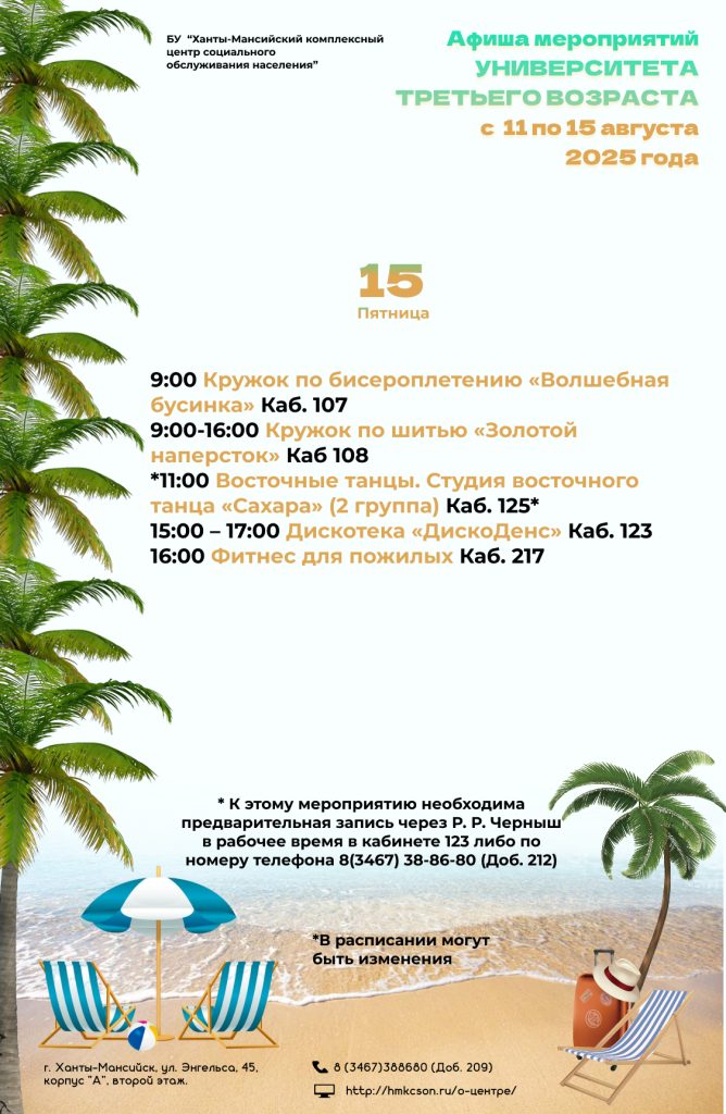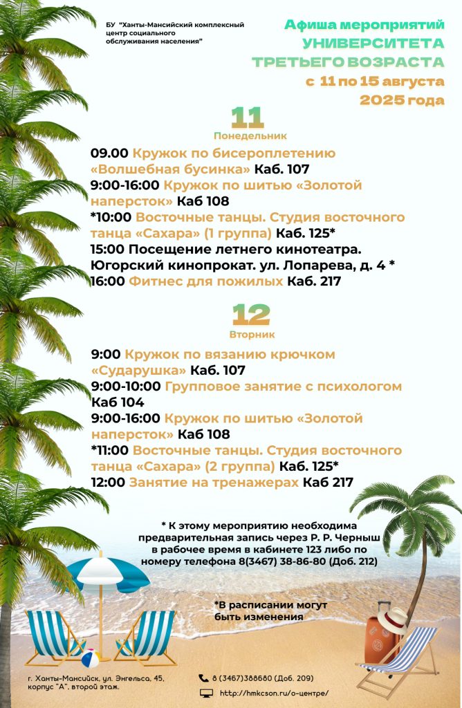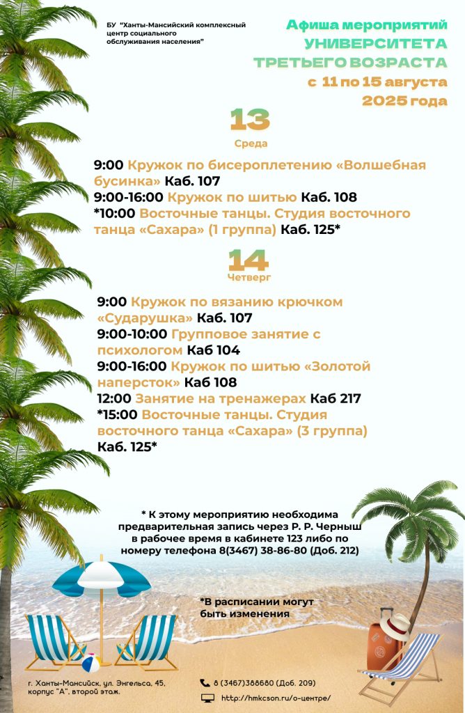 Расписание мероприятий Университета третьего возраста Ханты-Мансийского комплексного центра социального обслуживания населения на неделю — с 11 по 15 августа 2025 года